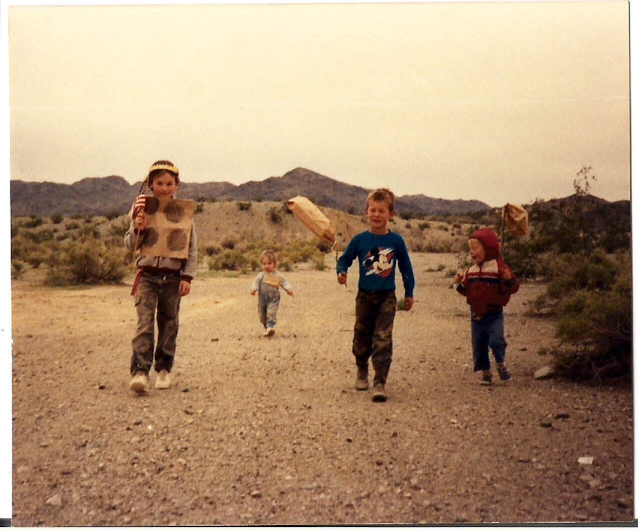 When I look at the stars at night, I can teleport instantly back into the velvet blackness of the Mojave desert of Arizona. Just as the sun began to drop behind the darkened purple mountains, no longer the faded colors of old bleached clothes that they and the sky were in full day, the life that had been hiding and gasping in shade that never cooled off enough to allow full breaths would stretch, shake off the dust, and emerge. Birds cheeped hesitantly and then broke into song, the coyotes scuttled in around the creosote with pink tongues lolling. As it grew too dark to see the ground, we would kick off our shoes if we wore any, and get up on something to avoid the snakes, scorpions and spiders that were now free to walk on rocks and sand that had recently been the temperature of a pan just snatched from the oven. Out at Jim’s Place, there were always vehicles scattered around our homesite, little boats in a night ocean. If we could, we would jump from one to the other and let the cooling metal creak and pop underneath us as the heat rose in waves. On cue, the breeze that the sun released would begin to stir through the low washes, tickling hair and bringing the scent of flowers too delicate for the day.